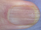 Lichen planus affecting the fingernails shows thinning and surface roughness of the nail plate with longitudinal ridges.